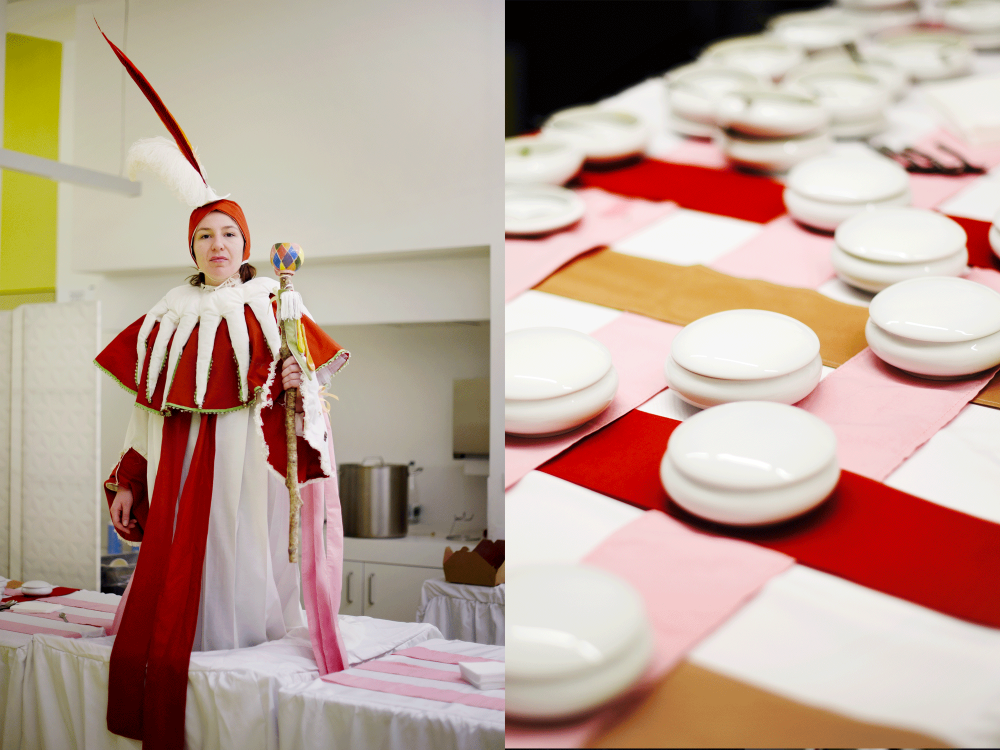 La grande table est recouverte de nappes blanches dans lesquelles se confondent les costumes des serveurs fous. Ils semblent jaillir de la nappe, surplombant le buffet, issés sur les estrades. Chaque serveur est vêtu d’un costume-nappe troublant ainsi les frontières entre la nappe et les costumes des personnages.
