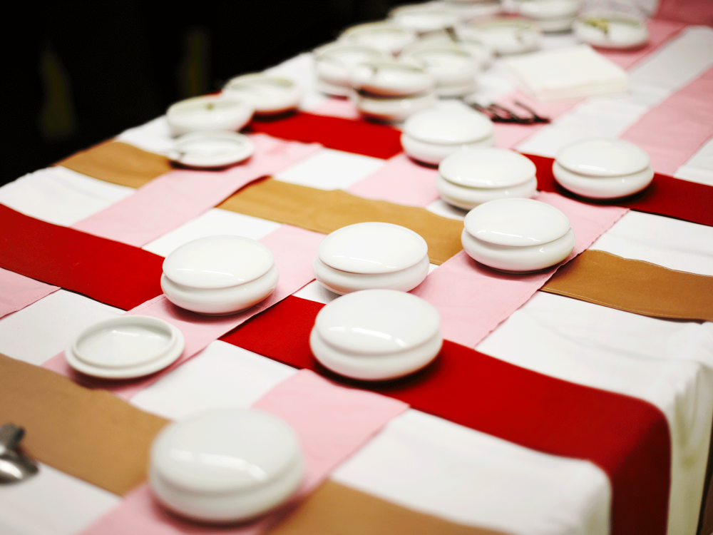 Un autre serveur, muni de deux marottes, assaisonne les mets de poule au pot. Ils sont servis dans des boîtes de porcelaine, disposées sur la table comme les pièces d’un échiquier.