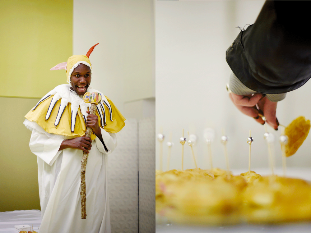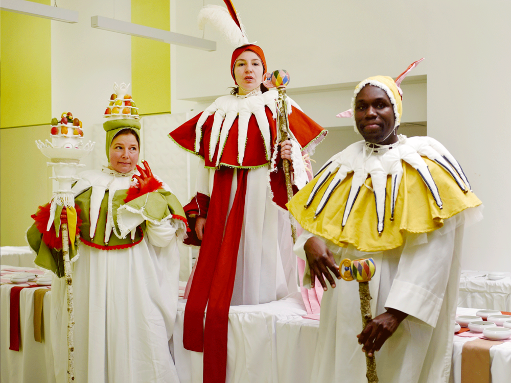 Performance culinaire pour la Nuit des fous au Louvre qui met en scène et en saveurs le banquet médiévial et les figures du fou. Les spectateurs déambulent autour d’un grand buffet en forme de «U» et dégustent 3 mets, présentés et mis en scène par les performeurs/serveurs.