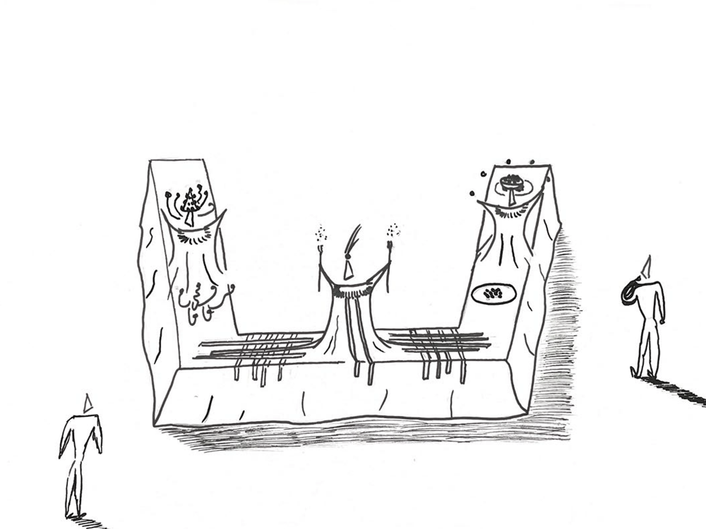 La grande table est recouverte de nappes blanches dans lesquelles se confondent les costumes des serveurs fous. Ils semblent jaillir de la nappe, surplombant le buffet, issés sur les estrades. Chaque serveur est vêtu d’un costume-nappe troublant ainsi les frontières entre la nappe et les costumes des personnages.
