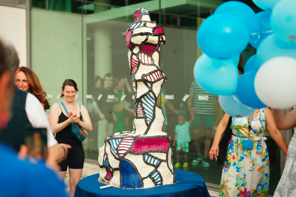 Pour les 20 ans du MAC VAL, nous avons concocté un gâteau-sculpture hors norme. Une pièce montée , réplique de "Chaufferie avec cheminée" la plus haute sculpture polychrome de Dubuffet jamais installée et édifiée devant le musée en 1996.